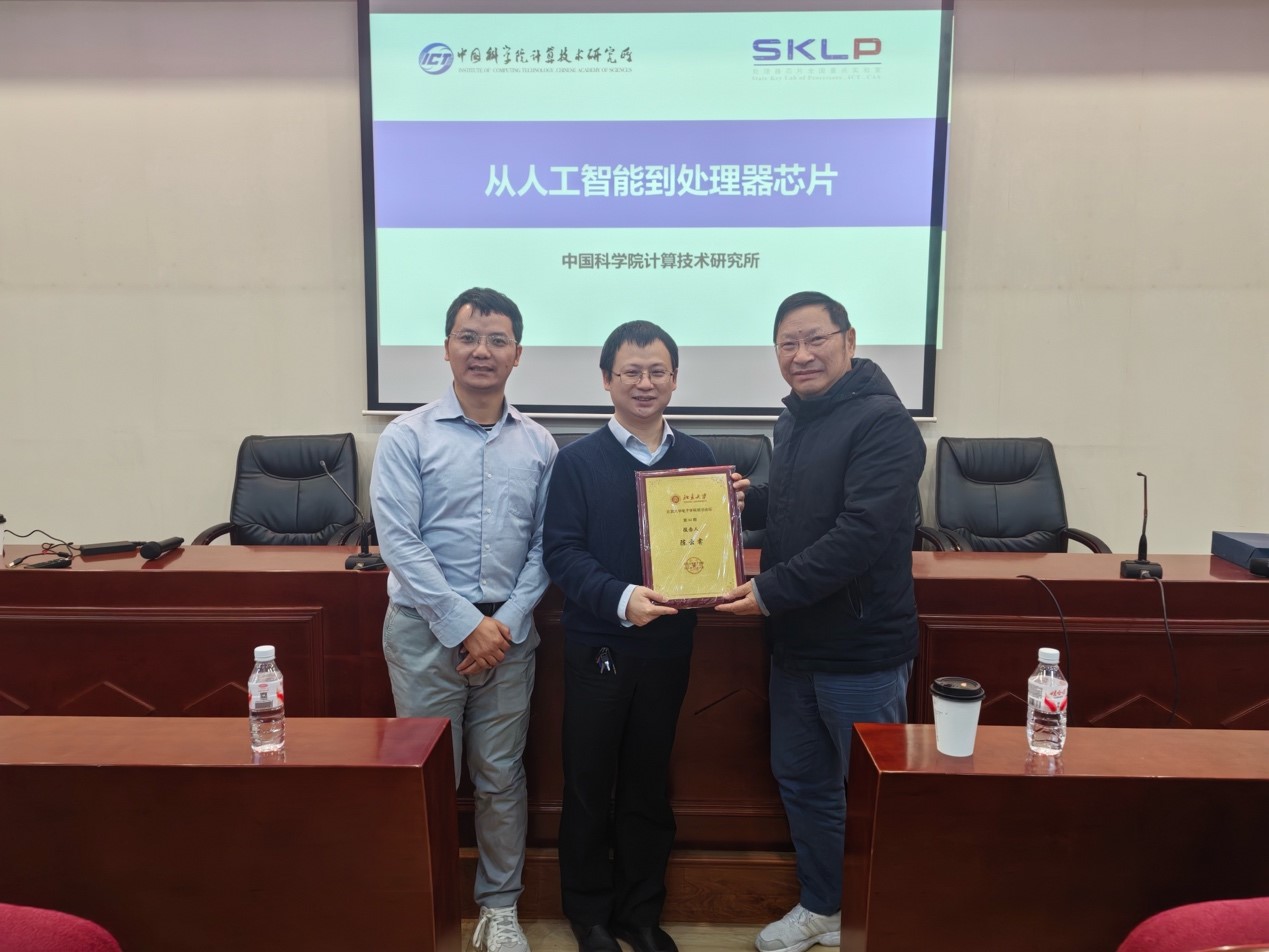 •    2025年12月4日,陈荣梅教授邀请了中国科学院计算技术研究所副所长、处理器芯片全国重点实验室主任、中国计算机学会体系结构专委会主任陈云霁应邀作题为《从人工智能到处理器芯片》的学术报告。彭练矛院士和陈荣梅教授共同为陈云霁研究员颁发讲座纪念牌